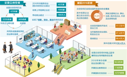眾創空間順應互聯網時代創新創業勢頭而生,成為搭載市場化機制、專業化服務和資本化途徑,為創業者籌謀的新型創業服務平臺。科技部火炬中心提供的數據顯示,兩年來,全國眾創空間已達4298家,與3200余家科技企業孵化器和400余家加速器共同形成接遞有序的創業孵化鏈條,2016年共服務創業團隊和初創企業超過40萬家,培育上市掛牌企業近1000家,帶動就業超過180萬人,實現了創新、創業、就業的有機結合與良性循環。