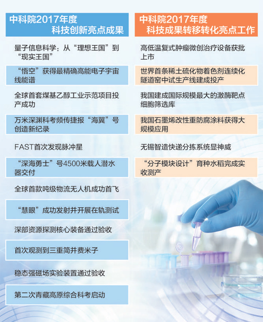 日前,量子信息科學(xué):從“理想王國(guó)”到“現(xiàn)實(shí)王國(guó)”;“悟空”獲得精確高能電子宇宙線(xiàn)能譜等12項(xiàng)獲中科院2017年度科技創(chuàng)新亮點(diǎn)成果。高低溫復(fù)式腫瘤微創(chuàng)治療設(shè)備獲批上市;世界首條稀土硫化物著色劑連續(xù)化隧道窯中試生產(chǎn)線(xiàn)建成投產(chǎn)等6項(xiàng)獲科技成果轉(zhuǎn)移轉(zhuǎn)化亮點(diǎn)工作。