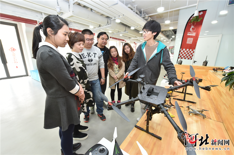 香河縣中信國安創客空間,創業者(右一)正向參觀者介紹自主研發的多旋翼無人機。記者霍艷恩攝
